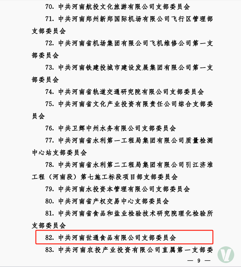 日前,省政府國資委黨委發(fā)文,對獲得省管企業(yè)“五星”黨支部進(jìn)行通報(bào)表彰,集團(tuán)所屬世通食品公司黨支部被授予省管企業(yè)“五星”黨支部榮譽(yù)稱號。